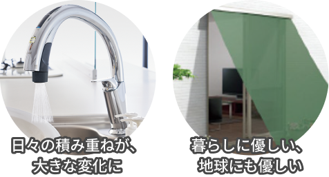 節水・節湯効果の高い機器や、保温効果の高い浴槽の採用は、限りある水資源を守るだけでなく、水が家庭に届くまでに必要なエネルギーや給湯エネルギーを抑え、CO2の削減に繋がります。 また、住まいの中で最も熱の出入りが多いのが窓などの開口部。窓やドア、壁など住まいの断熱性・遮熱性を高めることで冷暖房の効きがよくなり、冷暖房費やエネルギーの消費、CO2削減に繋がります。